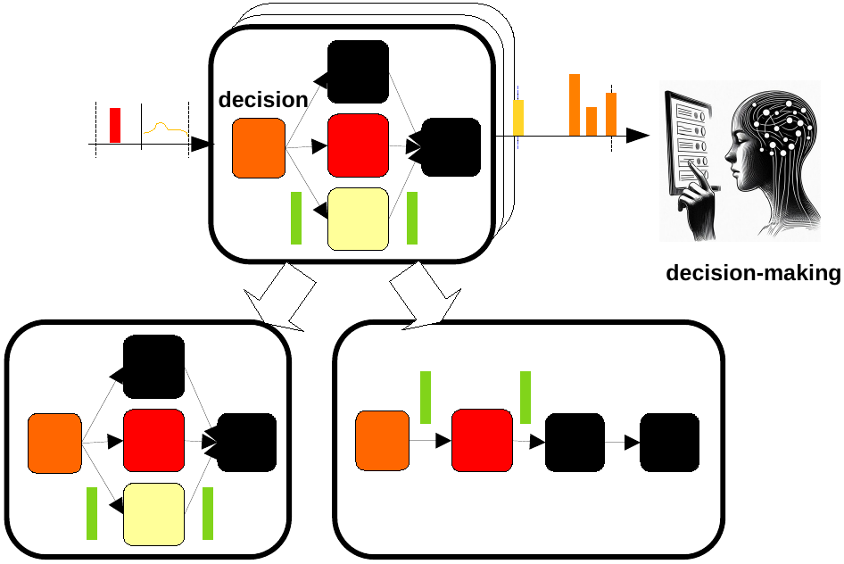 In reinforcement learning, it can be difficult to bring closer computational structures to real decision-making, or to the behavior of complicated mechanisms. Our approach allows decomposing a decision-making process, or the behavior of a complicated mechanism, into basic parallel or series structures of individual decisions (with or without dependencies), or individual components of the complicated mechanism, Using activity allows then to study precisely the flow of computations between the individual components, for bringing closer computational structures and their activity to the activity (number of decisions, spiking rate of a neural network, etc.) of the real system.
